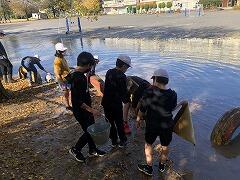 泥水がはねたり,足が水で濡れてしまったり,大変な思いをしながら,記録会が明日無事にできるように,学校のために頑張ってくれました。お陰で水はほぼ引いて,明日,明後日の記録会に支障はなくなりました。学校のために一生懸命やってくれる子ども達,本当に素晴らしいです!皆さん,ありがとうございました!