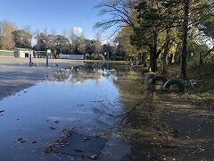 昨夜から今朝にかけての大雨で,校庭の大堀川側が冠水していました。朝から午前中一杯,用務員さんや先生方で溜まった水を流す作業をしていましたが,なかなか水は抜けません。
