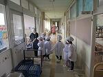 白衣を着て,担任の先生とワゴンを運び