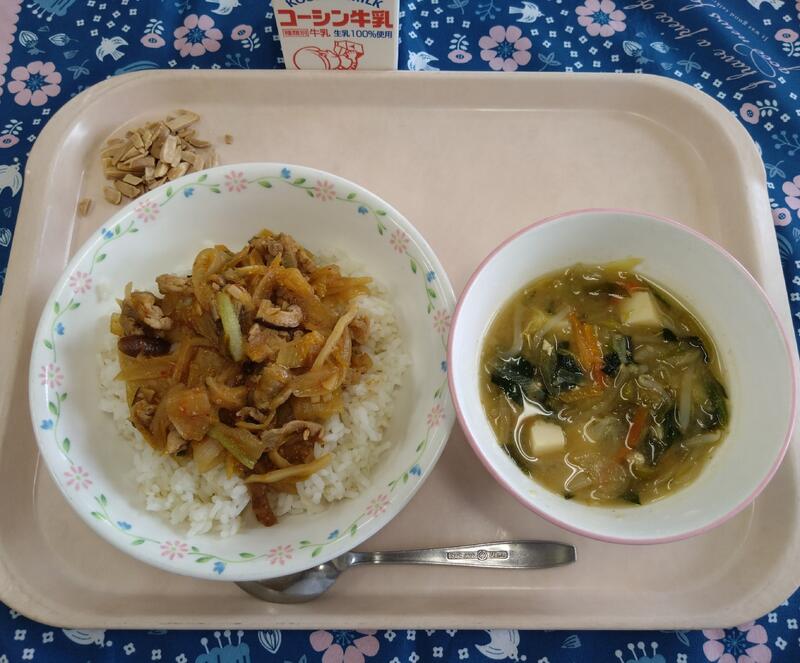 一覧へ 豚キムチ丼 日時 2026年03月02日(月) 公開対象 給食室 詳細 【今日の給食】牛乳 豚キムチ丼 豆腐の味噌スープ アーモンド 今日は,旨辛美味しいキムチを使った「豚キムチ丼」。キムチと豚肉の相性は抜群。 ごはんがすすみます。 作成者 高田小学校管理者 更新日時 2026-03-02 11:41:26