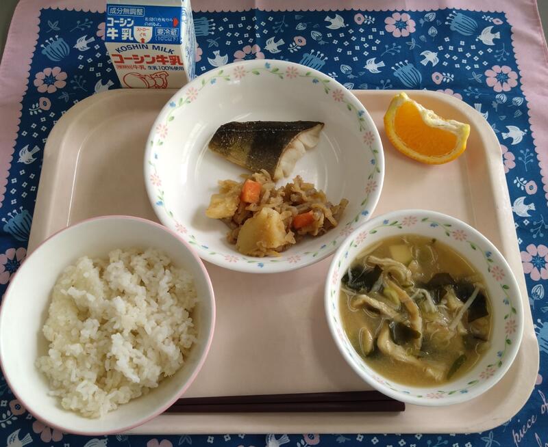 ごはん ほっけの一夜干し 切り干し大根とじゃがいものうま煮 えのきだけのみそ汁 いよかん※