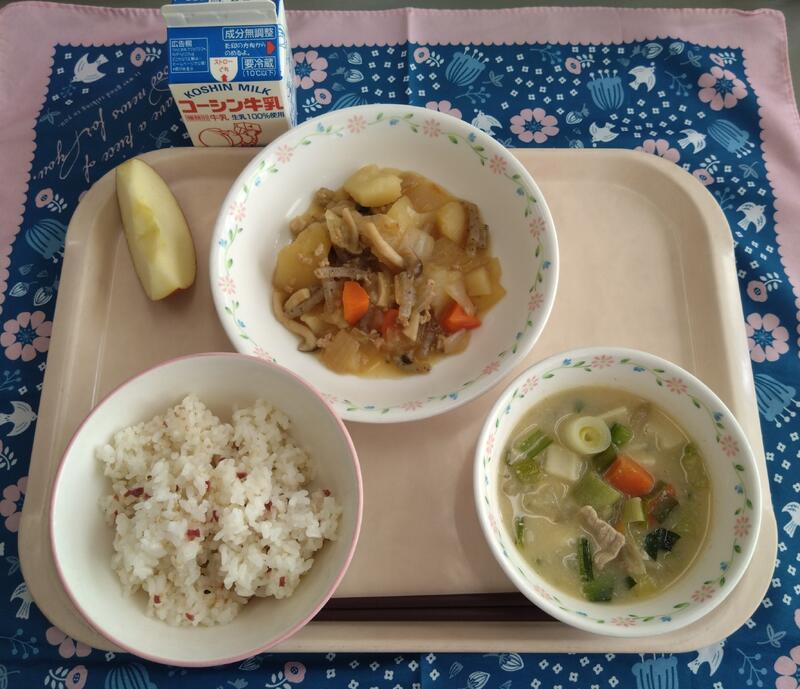 梅じゃこごはん じゃがいものそぼろ煮 ★ちくわぶとごろごろ野菜のみそ汁 りんご