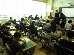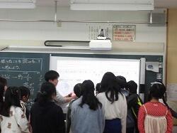 6年生の学習です。もう少し資料の読み取り方について聞きたい児童がプロジェクタの前に集まっています。