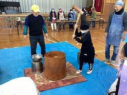 「みんなあつまれ柳の木の会」のみなさんに、ご協力いただき、1・2年生がお餅つきをしました。