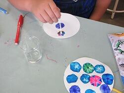 今日は,ほら, 水性ペンを水でにじませて,すてきなしおりやコースターを作りました。