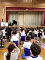 全校朝会に話を戻します。今月の歌は「勇気100%」です。音楽の佐藤先生が歌いやすいようにピアノを弾いてくれ、皆で元気よく歌うことができました。全校の皆で歌を歌うのっていいですね。