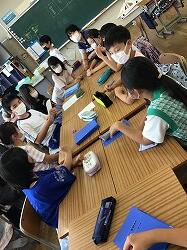 やや疲れ顔の中,房州うちわを作り始めた子ども達。
