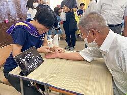 高校生に手相を見てもらう しいの木台のたかはし区長さんと,