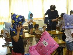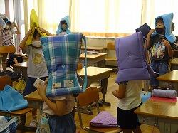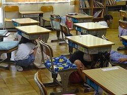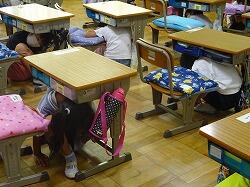 そこで練習。机にもぐる一時避難と,防災頭巾をかぶる練習をしてみました。