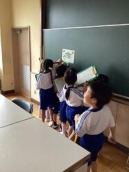 この間は先生や2年生がついていてくれたけれど今回はいません。完全に自分たちだけで学校内のいろいろな部屋を探しに行きました。各特別教室のドアや黒板にはってあるシールを集めて台紙にはります。