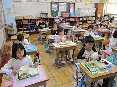いつもより早い配膳で給食を準備して,黙々とカレーライスを頂きました。