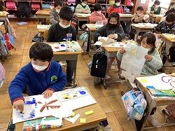 色んな形に紙を切って、絵の具をつけたスポンジでポンポンすると…