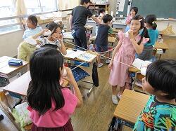 次は,音が伝わるときも物はふるえているか,糸電話で実験中!