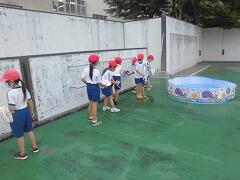蒸し暑くなり,1年生で予定した水遊びがバッチリ実施できました☆