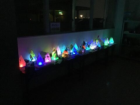 4年生の図工で制作した「ゆめいろランプ」を,日没後に