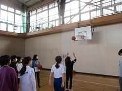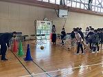 先生に英語で質問ができたら,シュートをしたり大繩を跳んだり。決まれば1ポイント!
