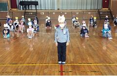 手作りのこぶた・たぬき・きつね・ねこのお面を付けて,かわいらしく