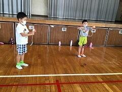 2年生が1年生に,生活科の学習で取り組んだコマ回しを教えてあげました。