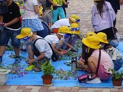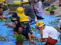 千日紅をはじめとした学校の植物は,夏休み中に高西小サポーターズクラブの方々が