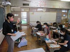 1年1組を会場にした「岩田学級」での模擬授業は,児童役の若手の先生たちが