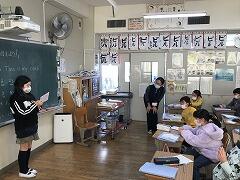 3年生の外国語では,図形を組み合わせて描いたカードをみんなに説明をして