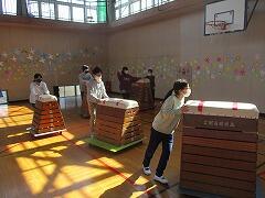 5時間目に,5年生みんなで体育館の用具を格納して,床やステージの水拭きを行いました。