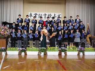 児童代表挨拶・花束贈呈の後,最後にみんなで校歌を3番まで一緒に歌いました。
