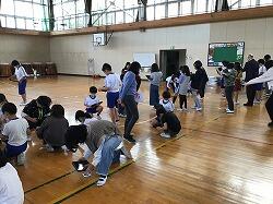 先生に英語で質問ができたら,シュートをしたり大繩を跳んだり。決まれば1ポイント!