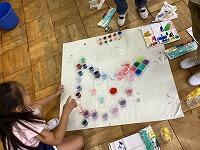 絵の具の使い方にも慣れてきた1年生。今日は透明の容器に色水を作って、グループでならべる活動を行いました。