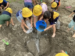 最初はさらさらな砂を触り,「あったかいね」「掘ると冷たくなってきたよ」と感触を楽しんでいると・・・