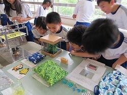 生活科の学習では,身近な生き物と触れ合う学習をします。今日は,持ってきた虫かごに虫のおうちを作りました。今までの経験から,土や草を入れたり,虫が隠れられる場所を作ったりと,みんな真剣です!図鑑で調べている子もいました。