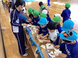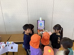 前半は,学校案内をしました。1年生が年長さんの手を取り「ここが図書室だよ」「休み時間は外でも遊べるんだよ」など,優しく説明できました。また,ランドセルや黄色い帽子を貸してあげると,「とても似合っているよ!」と声をかけ,年長さんも嬉しそうでした。