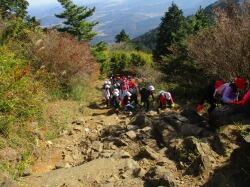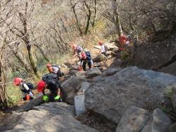 声を掛け合い、助け合い、険しい岩を登る姿。