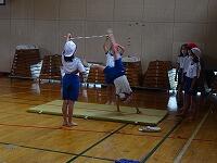 ・「かっこよく側転したいな」「高いゴムに届くように,足をぴーんと伸ばしてみよう!」「そうそう,できた,できた!」