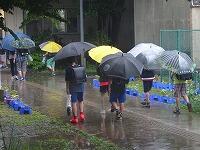 土砂降りの登校風景です。昇降口もビショビショでたいへん!