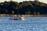 ところが手賀沼見学の船が止まってしまい,ボートでけん引されるトラブルが!