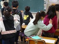 お別れする先生の学級は,笑いあり涙ありの,最後の帰りの会です。