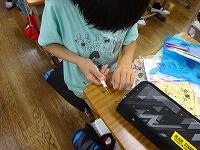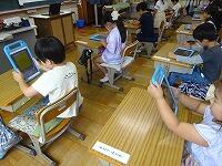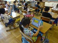 1年生がタブレットを使って,文字を打ったり図形を動かしたりしているよ。