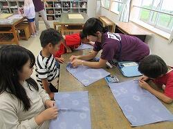 今日は,染め物をした布のはじをぬって,ハンカチを作っていたよ。
