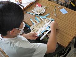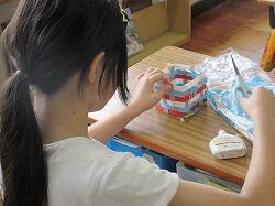 4年生図工,紙のクラフトテープを編んで,小物を作っているよ。
