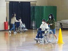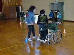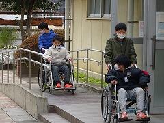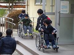 4年生は体育館内で車いすを押して動かしたり,玄関前のスロープで
