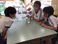 今回は試験管やビーカーなどガラス製の物の扱い方を学んだり,お湯でやけどしないように気を付けたりと,グループのメンバーと声を掛け合いながら行っています。結果が出るたびに「おぉ~」「すご~い」と反応しています。安全第一でこれからも実験していきます。
