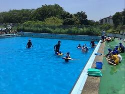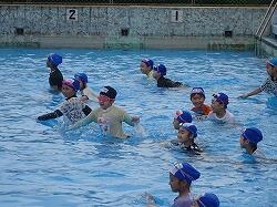 洋服を着て水に入った時の動きにくさを体験したあと,「浮いて待つ」ことを習いました。