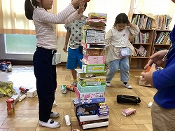 「下の方は大きい箱がバランスがいいよ」「丸い箱は使いにくいね」「長い箱はたてにすれば高くなるよ」