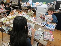 机の上に分類ごとに本が並んでいて,みんなは自由に手に取って見ることができます。