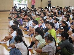 全校朝会に話を戻します。今月の歌は「勇気100%」です。音楽の佐藤先生が歌いやすいようにピアノを弾いてくれ、皆で元気よく歌うことができました。全校の皆で歌を歌うのっていいですね。