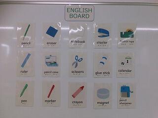 イングリッシュボードには、筆箱には入っていない文房具の言い方を掲示しています。