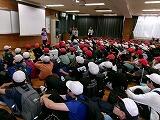 自分からは次の内容を話しました。「地震はいつ,どこで起こるか分からないこと」「休み時間や登下校,お家で留守番中に起こったらなどと考えてみること」「まずは自分で自分の身を守ること」最後に身の守り方の1つを実際にやってみました。(頭を腕で覆い隠す動作)