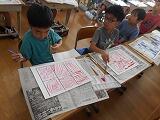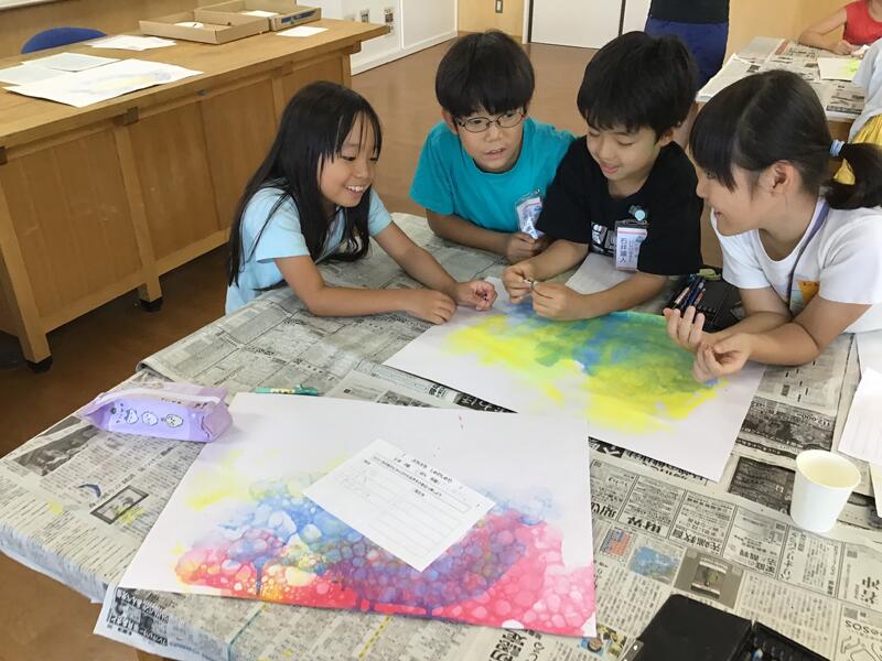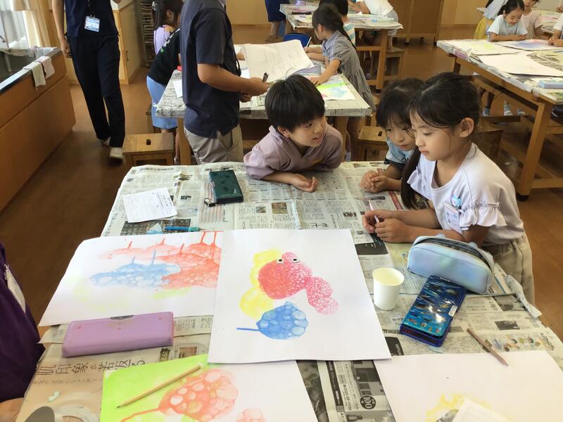 図工の学習です。シャボン液を泡立たせて、うつしとった泡の形から生き物を想像しました。
