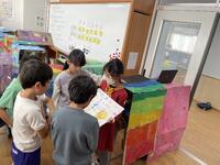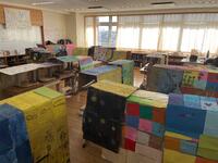 教室内の机といすを工夫して設置し、段ボールでカラフルな壁をつくって、めいろにしました。